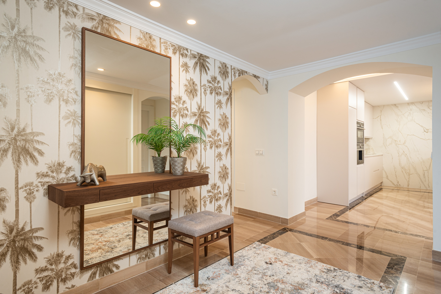 En esta renovación parcial transformamos por completo la entrada, los dormitorios y la zona de salón-comedor. Incorporamos mobiliario nuevo cuidadosamente seleccionado y papeles pintados decorativos que aportan textura, estilo y personalidad a cada ambiente.
