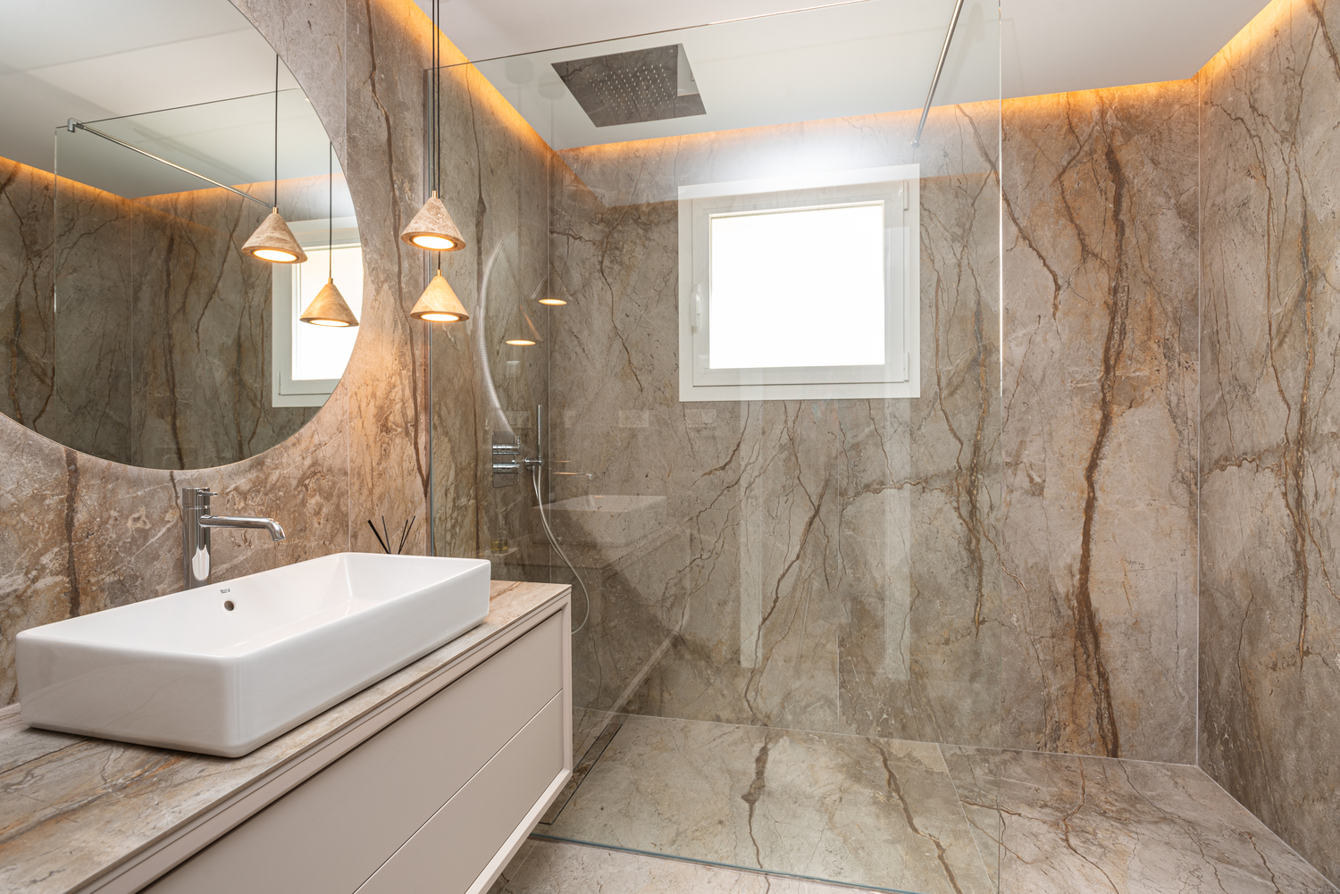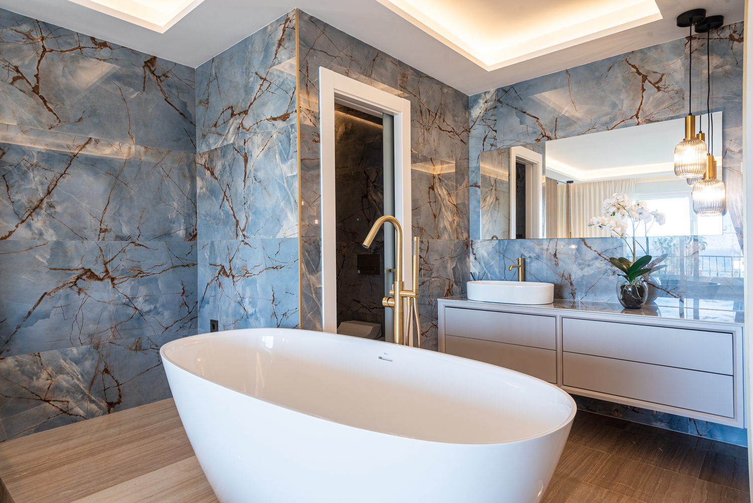 El baño, por su parte, ha sido concebido para centrarse en las impresionantes vistas, integrando el paisaje como parte esencial del diseño.