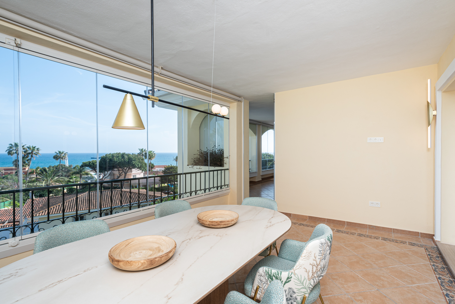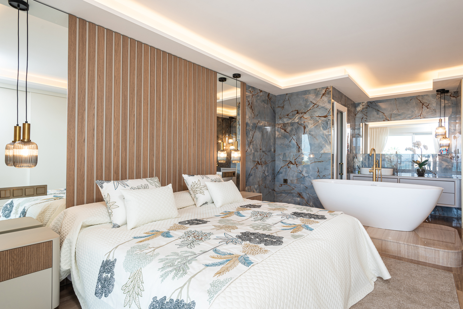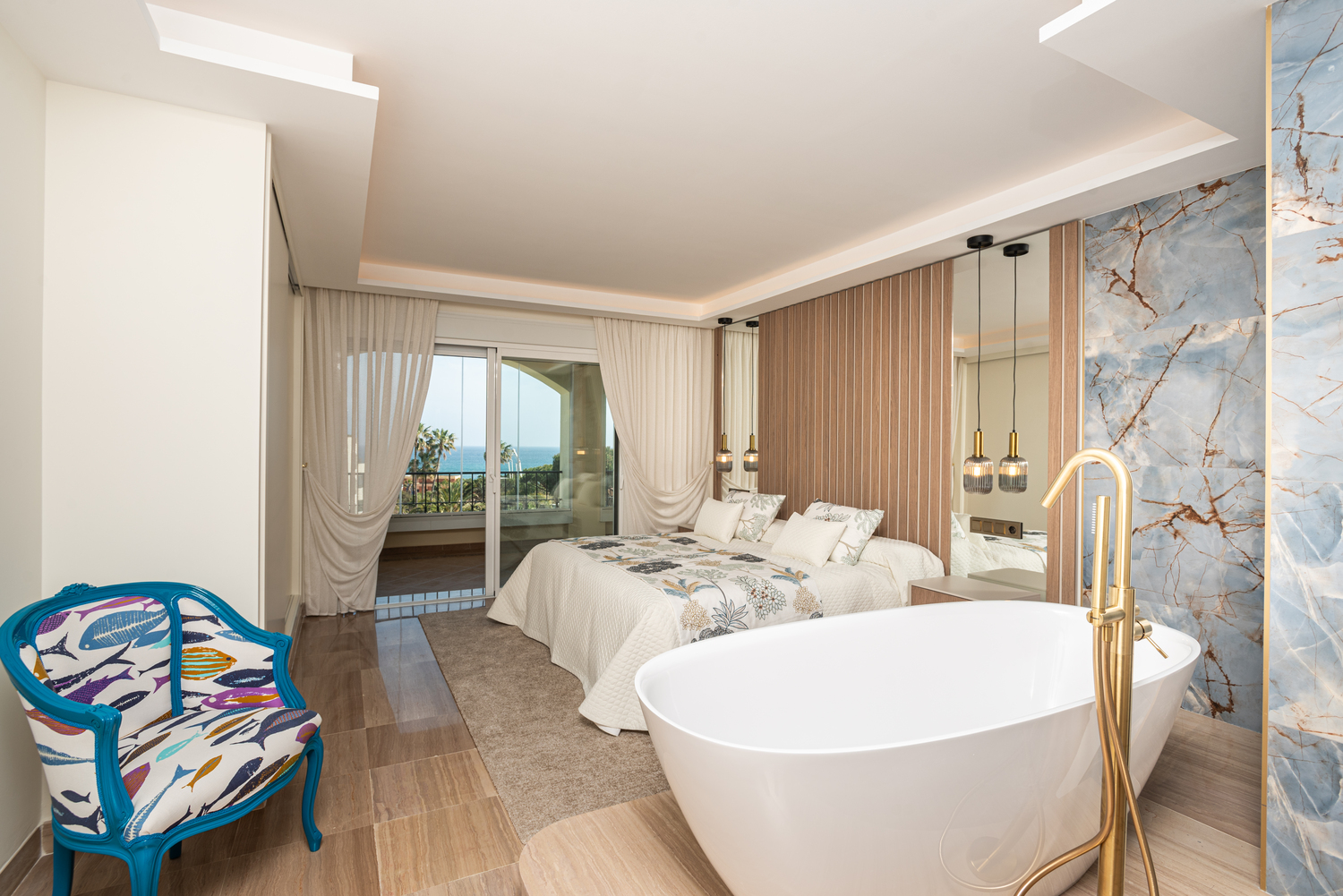 Las espectaculares vistas al jardín con piscina son las protagonistas de esta villa, resaltadas por los grandes ventanales que abren el espacio hacia el exterior, permitiendo una conexión fluida entre ambos ambientes. En el salón, la gran chimenea de mármol se convierte en el punto focal y pieza clave de la decoración, aportando calidez y elegancia. Las cortinas hasta el suelo complementan los ventanales, destacando la caída suave de la tela y realzando la atmósfera acogedora.